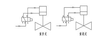 4.雙作用工作原理:當(dāng)控制器按照預(yù)編程序向電磁換向閥輸出電信號(hào)時(shí),電磁換向閥通過(guò)切換電磁換向,使加壓儀表的壓力源進(jìn)入。閥。氣動(dòng)執(zhí)行機(jī)構(gòu)的下腔向上推動(dòng)活塞,活塞驅(qū)動(dòng)閥桿,閥桿抬起閥芯打開(kāi)閥門,切斷換向閥的電信號(hào),使活塞向后移動(dòng)關(guān)閉閥門。該閥門配置稱為“關(guān)閉”。相反,為了使常開(kāi)型,只能改變電磁換向閥和氣動(dòng)執(zhí)行器的連接方式(見(jiàn)下圖)。
