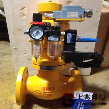 當信號壓力為零,閥芯處于初始狀態(常開或常閉)。當執行機構接到信號壓力(0.4~0.6MPa)時,帶動推桿、閥體、閥芯移動到極限位置,使閥門全開或全關。達到對管道內介質接通、切斷或管路間切換控制。配用二位五通電磁閥,使活塞式切斷閥控制更加方便、簡捷。