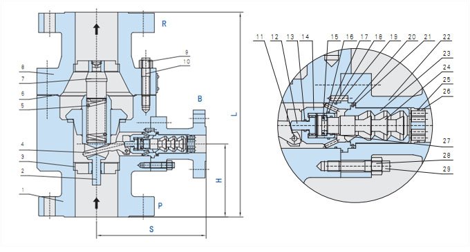 產品介紹 一、自動回流三通閥產品概述: ZDM/ARC1000 自動回流三通閥是一個獨立的多功能控制系統,能夠動態的感知主流道的變化,隨主流道調節旁路介質流量,它積極了截止閥,止回閥,多級調節閥減壓閥功能于一身。自動再循環閥安裝于鍋爐給水泵出口、對給水泵起安全保護作用。泵保護閥(它)用于防止給水泵的低負荷運行時由于過熱、嚴重噪音,不穩定汽蝕引起損壞。 二、自動回流三通閥工作原理: ZDM/ARC1000自動回流三通閥介質經過閥門入口進入閥體,閥芯同時也是測量部件感受到流量通過,當流量小于設定值時,液體通過閥座上的開孔并通過閥桿同時也是旁路閥芯的減壓調節通道做旁路循環。當出口流量大于所設定流量時,流體進入主管道中并逐漸關閉旁路,進行正常流動。 據感應到的主路流量不同,自動再循環泵保護閥的主閥瓣止回錐將自動移動到某一個位置上。同時主閥瓣帶動旁路閥閥桿,將主閥瓣動作傳遞至旁路,通過控制旁路閥閥瓣的位置,改變旁路的節流面積,從而控制通過旁路的流量。當主閥瓣回至閥座關閉狀態時,所有流量通過旁路回流。當主閥瓣上升至頂端位置時,旁路則完全關閉,所有泵的流量流向工藝系統。該閥集四種功能于一體。 流量感知:自動再循環閥的主閥瓣能自動感知工藝系統中的主流量,從而根據此流量來確定主閥瓣和旁路閥瓣的位置。 再循環控制:自動再循環泵保護閥可以將泵正常運行所需要的最小流量通過旁路吸入到存儲裝置中,調節水泵的H-Q特性,實現再循環。 旁路多級減壓:旁路控制系統能低噪音小磨損的把回流介質從泵出口的高壓減至適宜回流存儲裝置中的低壓。 止回:自動再循環閥還具有止回閥的作用,防止液體回流到泵體中。標準型旁路帶止回功能。 其它旁路尺寸可按要求制作;最大的旁路流量取決于最大的Kv值 三、自動回流三通閥性能優勢: 1.包括回流的減壓設施,使高壓介質經多次小通徑繞流,消耗大量的能量,而降低壓力。 2.只在流量很低時才有回流功能,使泵冷卻,在泵正常運行時,并沒有回流,從而可節省因連續再循環所消耗的電能和水能。 3.自動回控制閥不需要電氣配線,也不需要兩個調節閥串聯,一個用于調節,另一個用于切斷。并把高壓系統容易產生的高速流拉線和侵蝕現象減到zui少。 4.具有設計合理,運行平穩,無噪音,壽命長等特點,可完全替代進口產品。 5.閥門應垂直安裝。 四、自動回流三通閥結構參數: 1、公稱通徑:DN40~350 2、公稱壓力:PN10-PN420 3、旁路尺寸1-8(標準);或特殊 4、推薦流速:4~6米/秒 zui高8米/秒 5、連接方式:法蘭連接(ANSI或DIN) 6、鑄碳鋼,鍛碳鋼,鑄鉻鎳鉬鈹不銹鋼,鍛鉻鎳鉬鈹不銹鋼 五、自動回流三通閥結構圖 :![]() | ||