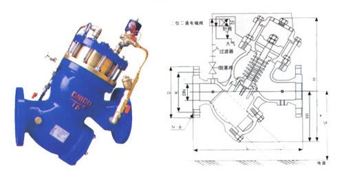 產品介紹 一、YQ98006型過濾活塞式電磁控制閥--產品概述: YQ98006型過濾活塞式電磁控制閥由主閥、電磁導閥、針閥、球閥、微形過濾器組成水力控制接管系統;通過電磁導閥可以實現對閥門開啟和關閉的遙控,當閥門從進口端給水時,水流流過針閥進入主閥上腔控制室,當電磁導閥打開時,控制室內的水經電磁導閥、球閥流出。球閥開度大于針閥開度,主閥上腔控制室內壓力變低,主閥處于全開狀態;當電磁導閥關閉時。 主閥上腔控制室的水不能流出,控制室升壓,推動活塞關閉主閥;本產品利用導閥控制閥門的開啟和關閉,反映準確快速,采用三向電磁閥,維護簡單;安裝于各類給水系統的管道上。 二、YQ98006型過濾活塞式電磁控制閥--工作原理: 分隔膜型和活塞型兩類,主要部件有一個主閥及其附設的導管、導閥、針閥、球閥和壓力表等組成的。它利用上下游壓力差為動力,由導閥控制、使隔膜(活塞)上方控制室內的壓力水被排到大氣或下游低壓區時,作用在閥盤底部和隔膜下方的壓力值就大于上方的壓力值,所以將主閥閥盤推到完全開啟的位置,當進入隔膜(活塞)上方控制室內的壓力不能排到大氣或下游低區時,作用在隔膜(活塞)上方的壓力值就大于下方的壓力值,所以就會把主閥閥盤壓到完全關閉位置,當隔膜(活塞)上方控制室內的壓力值處于入口壓力與出口壓力中間時,主閥閥盤就處于調節狀態。 三、YQ98006型過濾活塞式電磁控制閥--技術參數: